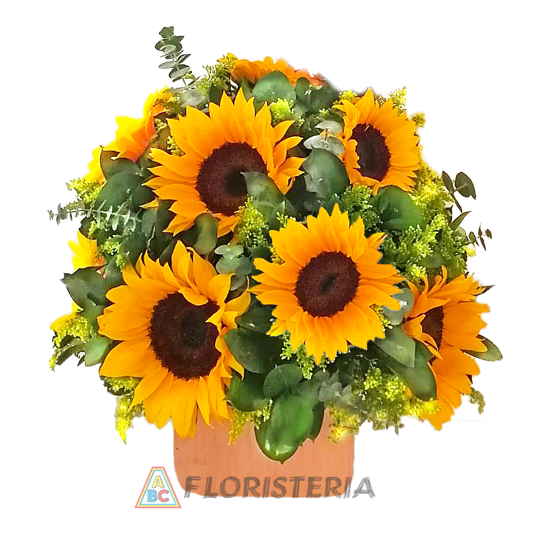 15 rosas rojas 12 girasoles 3 follaje variado 2 Flor de complemento ( Aster o Solidado). 1,5 oasis doble 1 Base de madera mediana