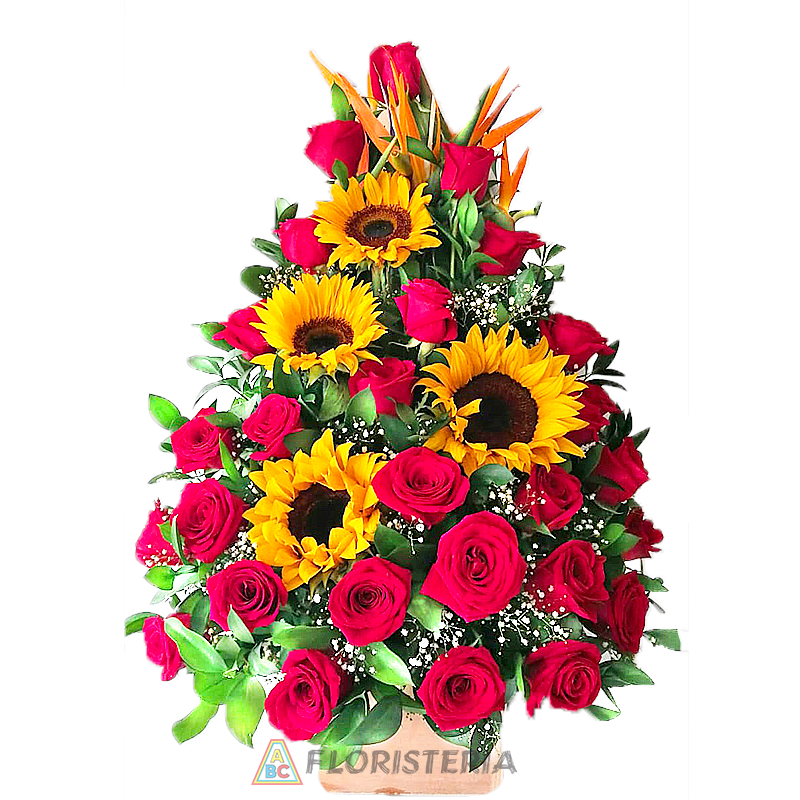 1 Base de madera mediana 1 Flor de complemento ( Aster o Solidado). 5 Girasoles 20 rosas rojas 4 Manzanas 1 Gajo de Uva. 2 …