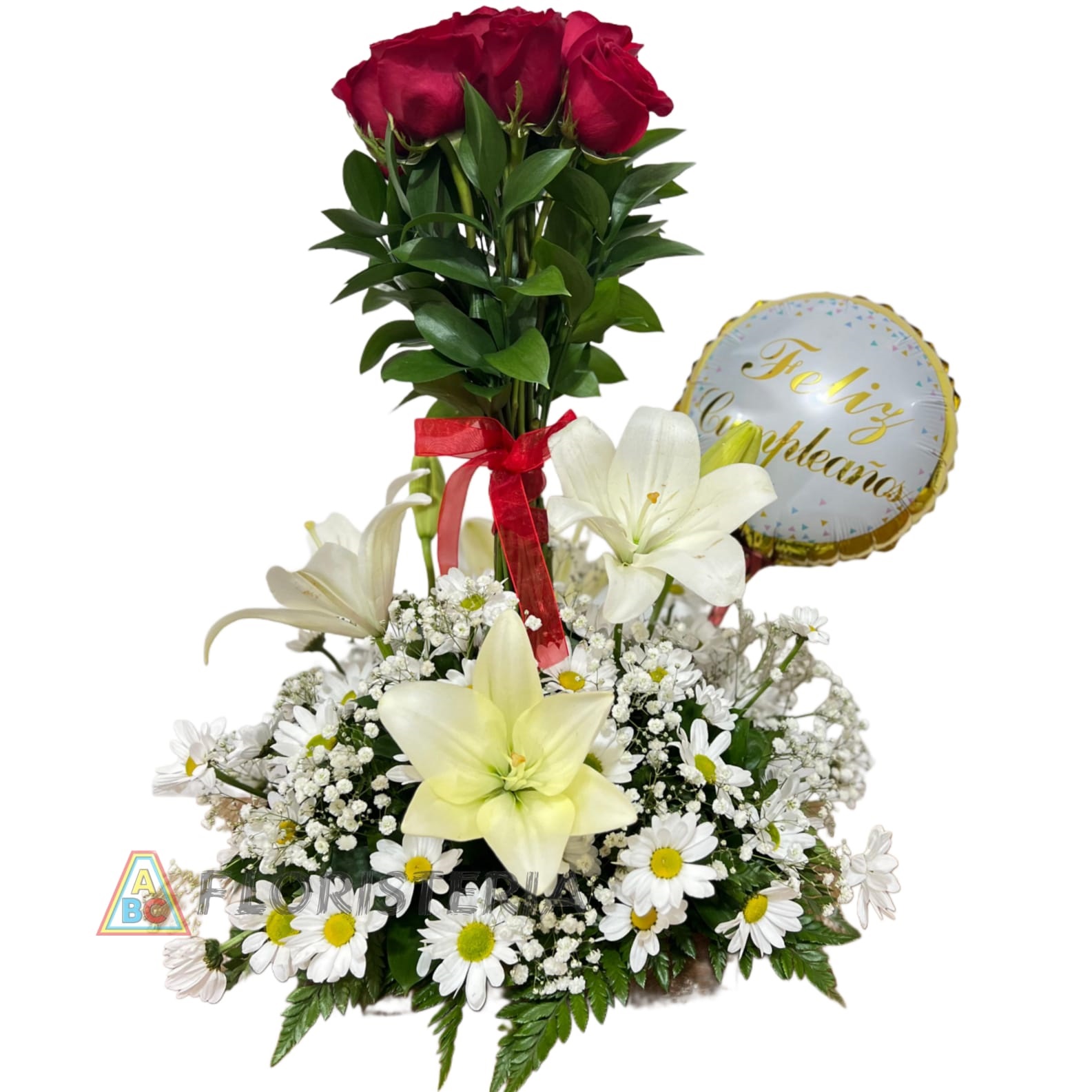 14 Rosas Rojas 8 Manzanas 1 Gajo de Uva. 2 Girasoles 4 Follaje variado 0,25 Follaje variado (Dracena) 1 Flor de complemento ( Aster o …