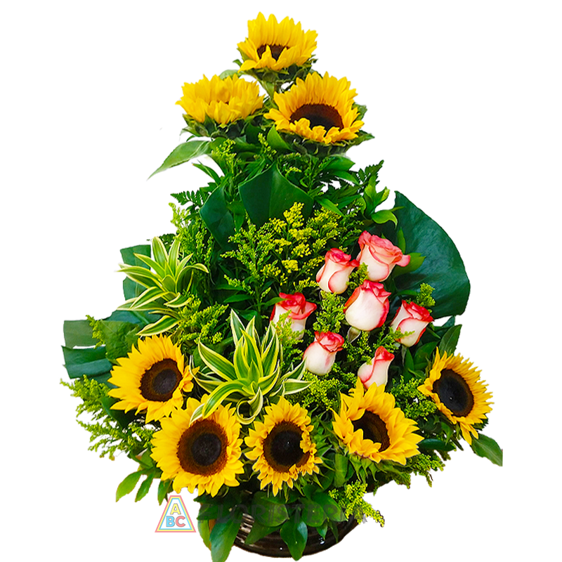 14 Rosas Rojas 8 Manzanas 1 Gajo de Uva. 2 Girasoles 4 Follaje variado 0,25 Follaje variado (Dracena) 1 Flor de complemento ( Aster o …