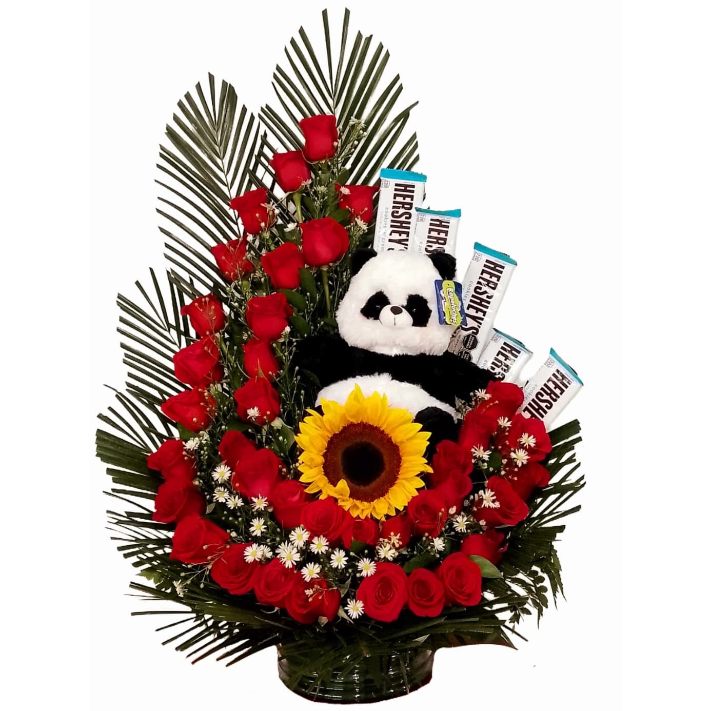 1 Base de madera mediana 1 Flor de complemento ( Aster o Solidado). 5 Girasoles 20 rosas rojas 4 Manzanas 1 Gajo de Uva. 2 …