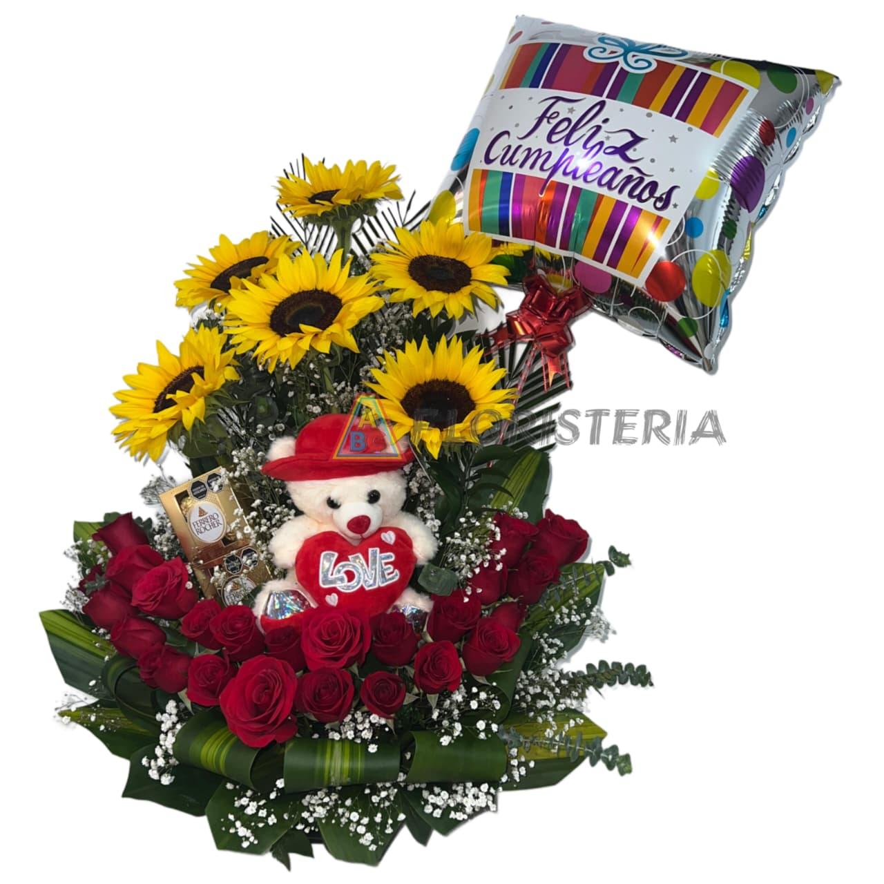 7 Girasoles 12 Rosas Rojas 5 Follaje variado Hojas de Balazo 1 Flor de complemento ( Aster o Solidado). 2 Follaje variado 1 Peluche mediano…